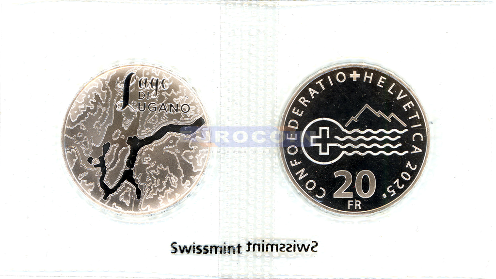 Швейцария 20 франков 2025, Лугано - озеро на южном склоне Альп