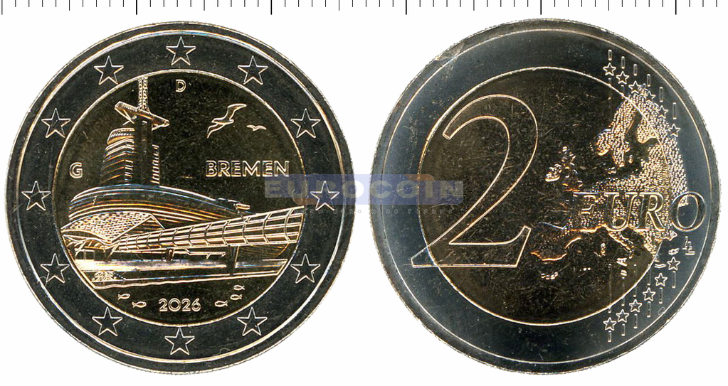Германия 2 евро 2026, Бремен - это город на реке Везер в северо-западной части Германии.