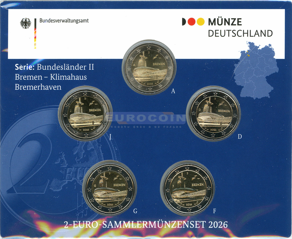 Германия 2 евро 2026, Бремен - это город на реке Везер в северо-западной части Германии. (A,D,F,G,J) BU