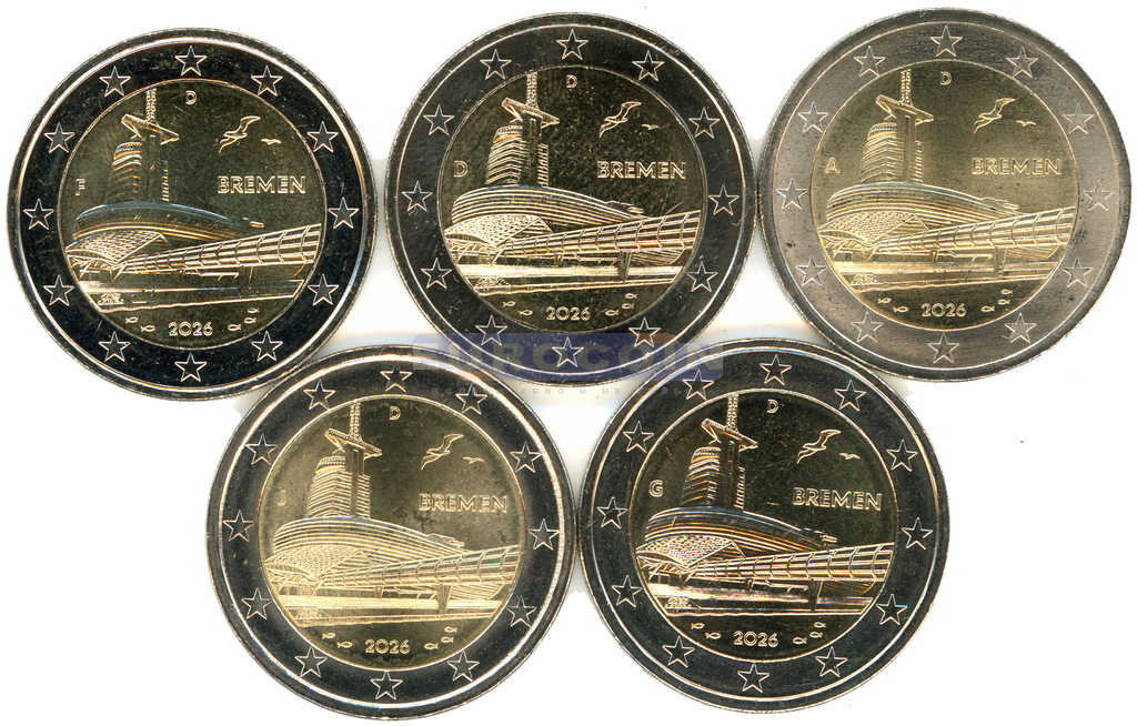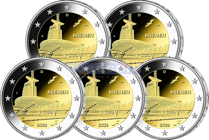 Германия 2 евро 2026, Бремен - это город на реке Везер в северо-западной части Германии (A,D,F,G,J)