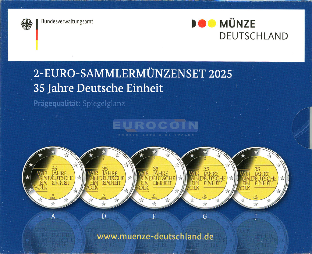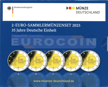 Германия 2 евро 2025, 35-летие объединения Германии, все монетные дворы (A,D,F,G,J) PROOF