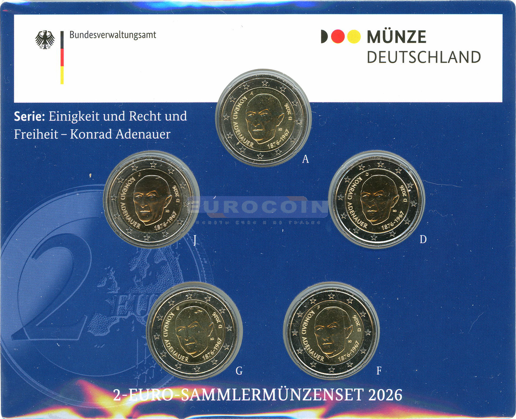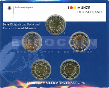 Германия 2 евро 2026, Конрад Аденауэр - немецкий государственный и политический деятель (A,D,F,G,J) BU