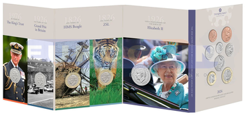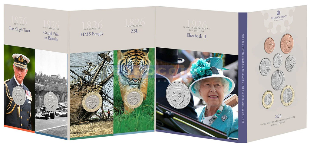 Великобритания, официальный годовой набор 2026 (13 монет): 1 - 50 пенсов - 1 и 2 фунта + + 2 x 50 пенсов (Гран-при Великобритании и Траст Короля) + 2 х 2 фунта (Зоологическое общество Лондона и HMS «Бигль») + 5 фунтов (Королева Елизавета II)