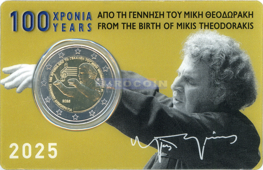 Греция 2 евро 2025, 100 лет со дня рождения Микиса Теодоракиса - BU