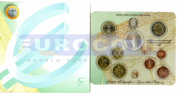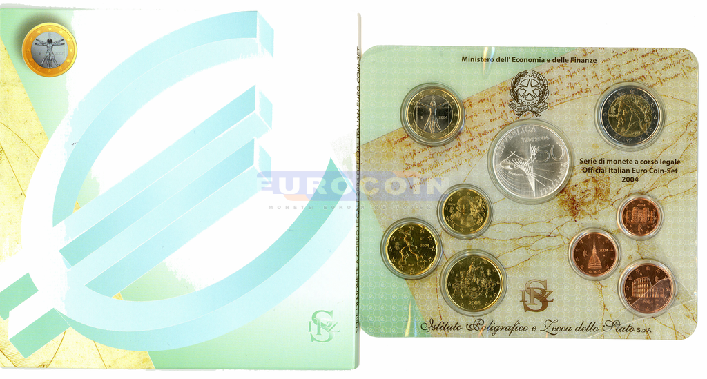Италия, набор евро 2004 BU (9 монет) - 1 цент - 2 евро + 5 евро ( 50 лет телевидению в Италии)