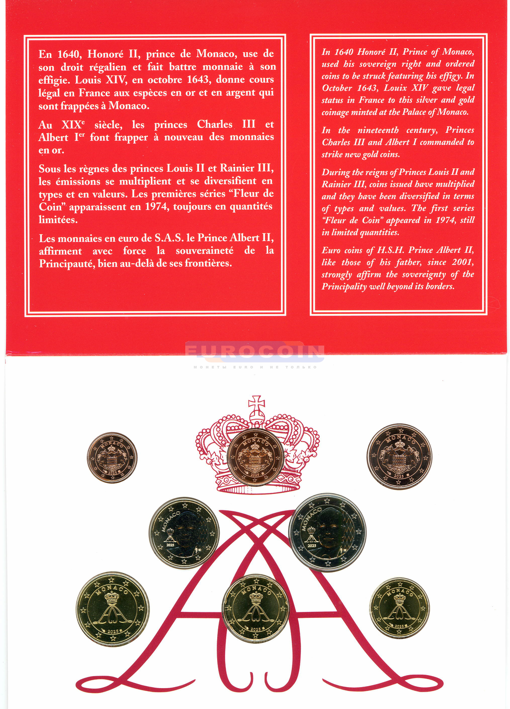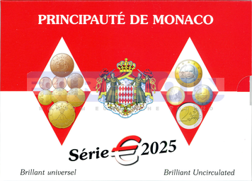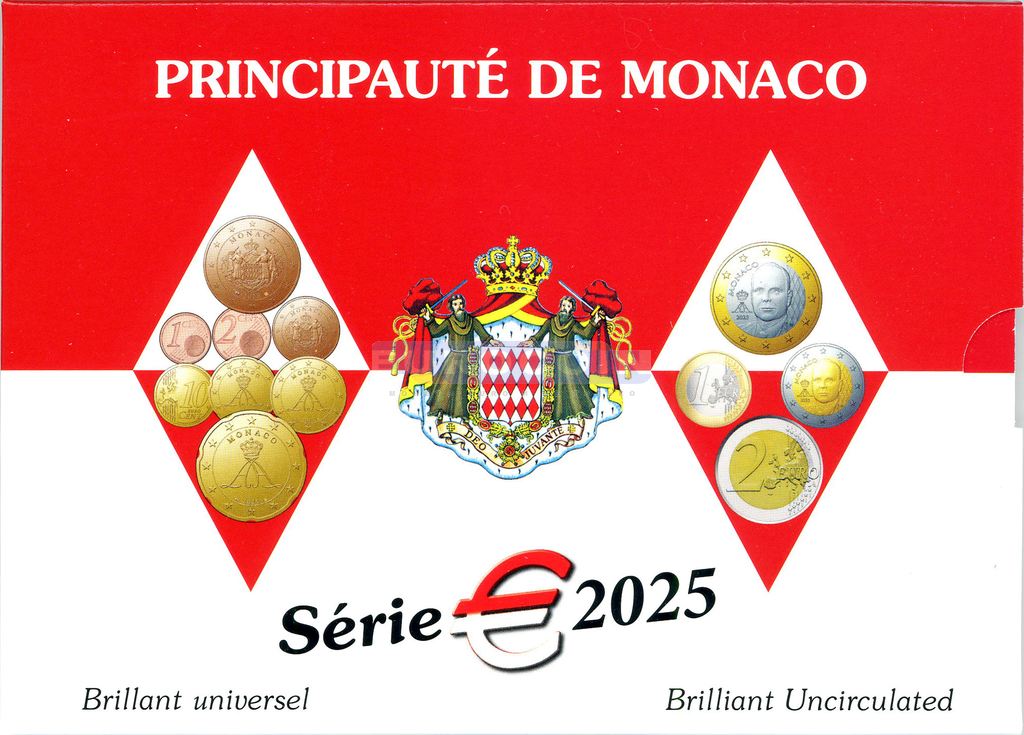 Монако, официальный годовой набор евро 2025 BU (8 монет) - 1 цент - 2 евро (1 евро и 2 евро c новым дизайном)