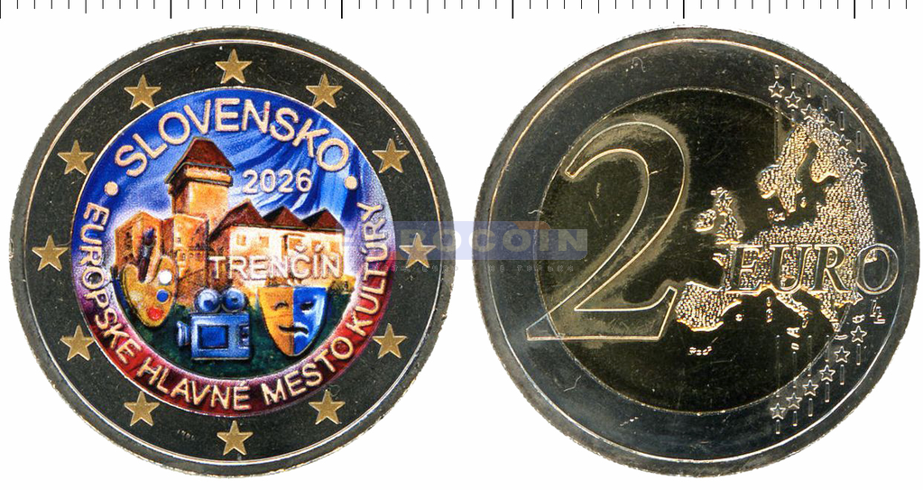 Цветная монета, Словакия 2 евро 2026, Тренчин - Культурная столица Европы