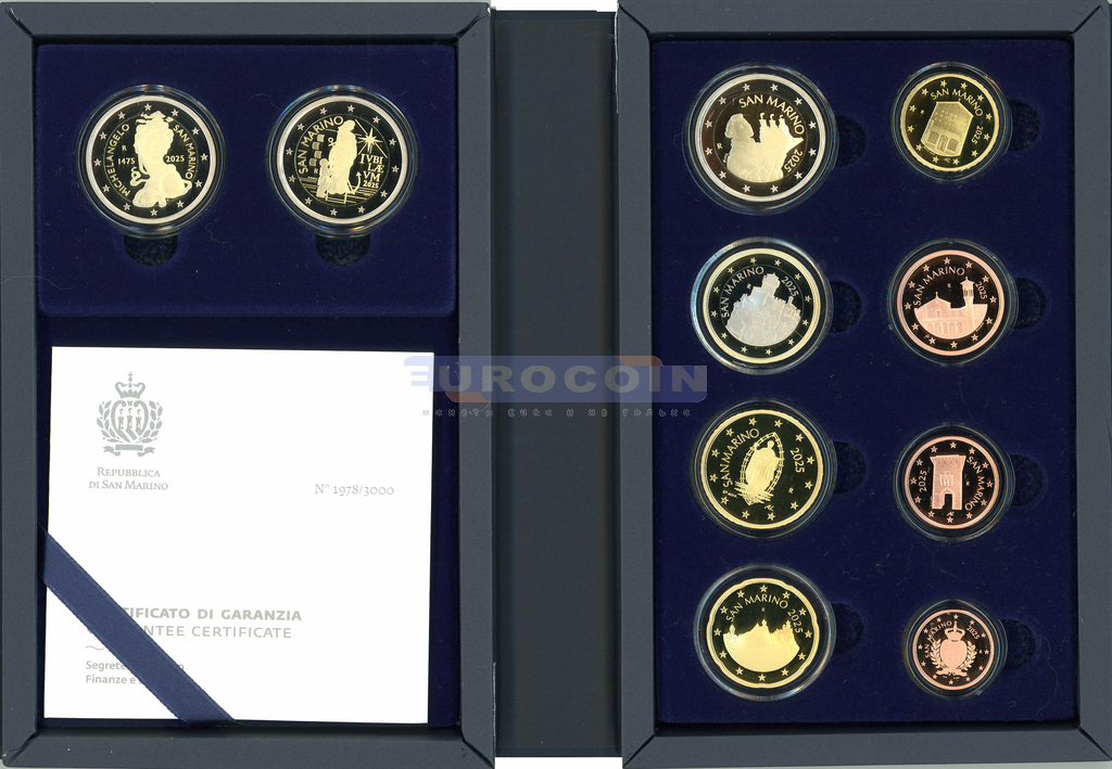 Сан-Марино, официальный годовой набор 2025 (10 монет) - 1 цент - 2 евро + 2 евро (Юбилейный год) + 2 евро (Микеланджело)