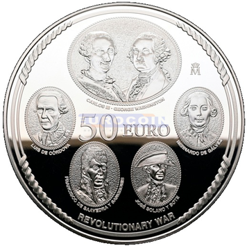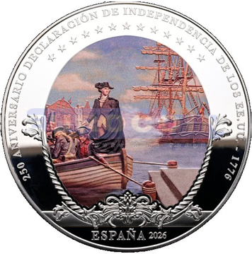 Испания 50 евро 2026, вклад Испании в успех войны в пользу тринадцати американских колоний и провозглашние независимости от Великобритании - монета из серии «250 лет провозглашения независимости Соединенных Штатов»